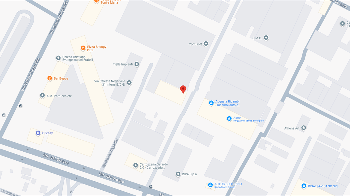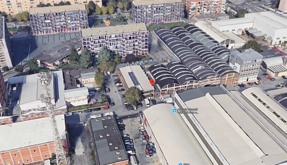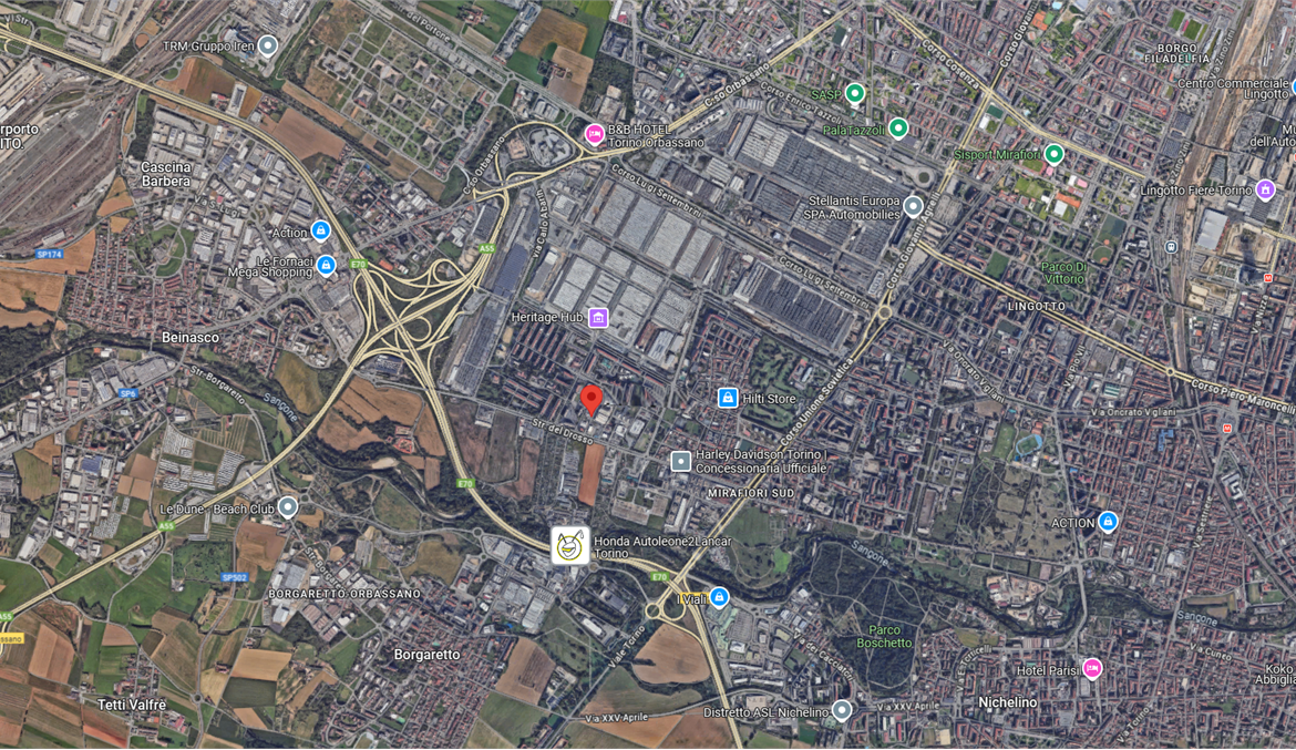 In zona Mirafiori sud, in una zona industriale di Torino, caratterizzata dalla presenza di molti capannoni e attività produttive. L’area è comoda per la logistica, grazie alla vicinanza con la tangenziale e le principali vie di comunicazione.